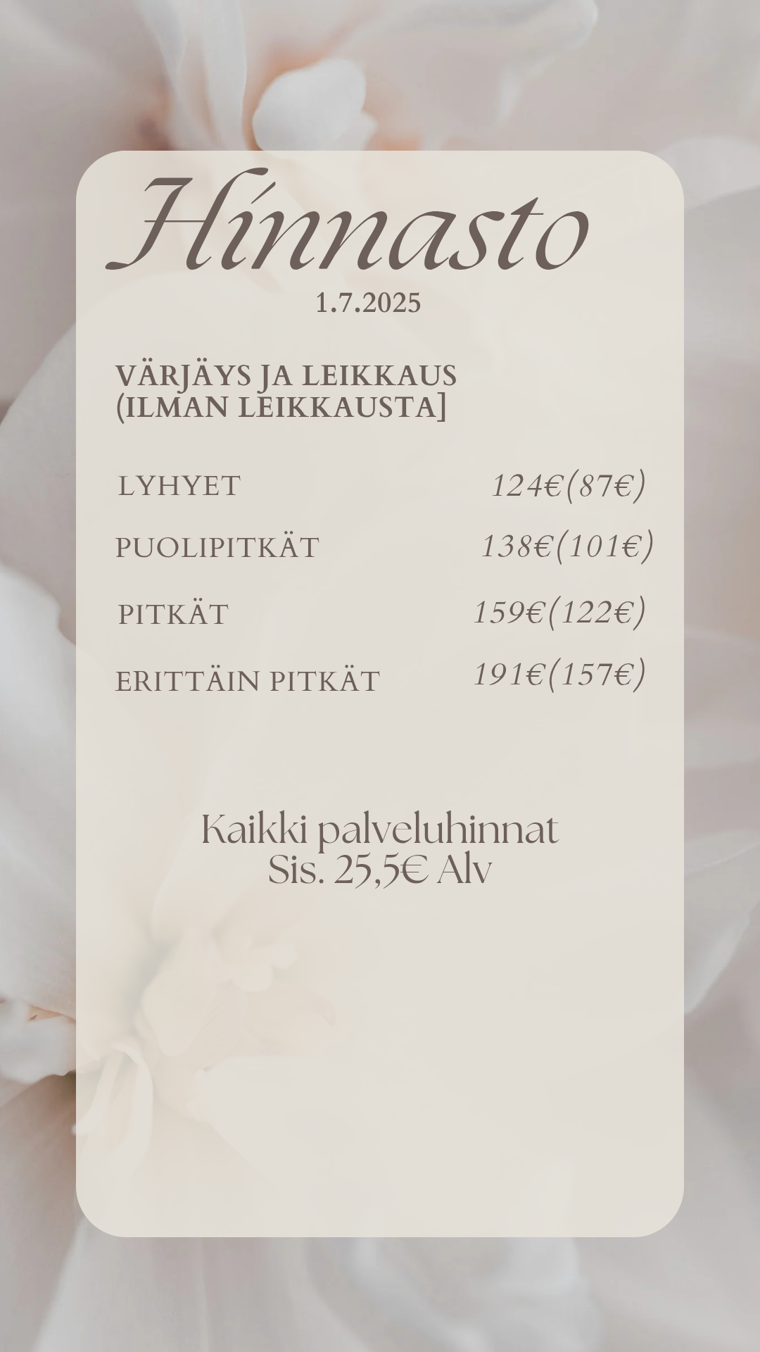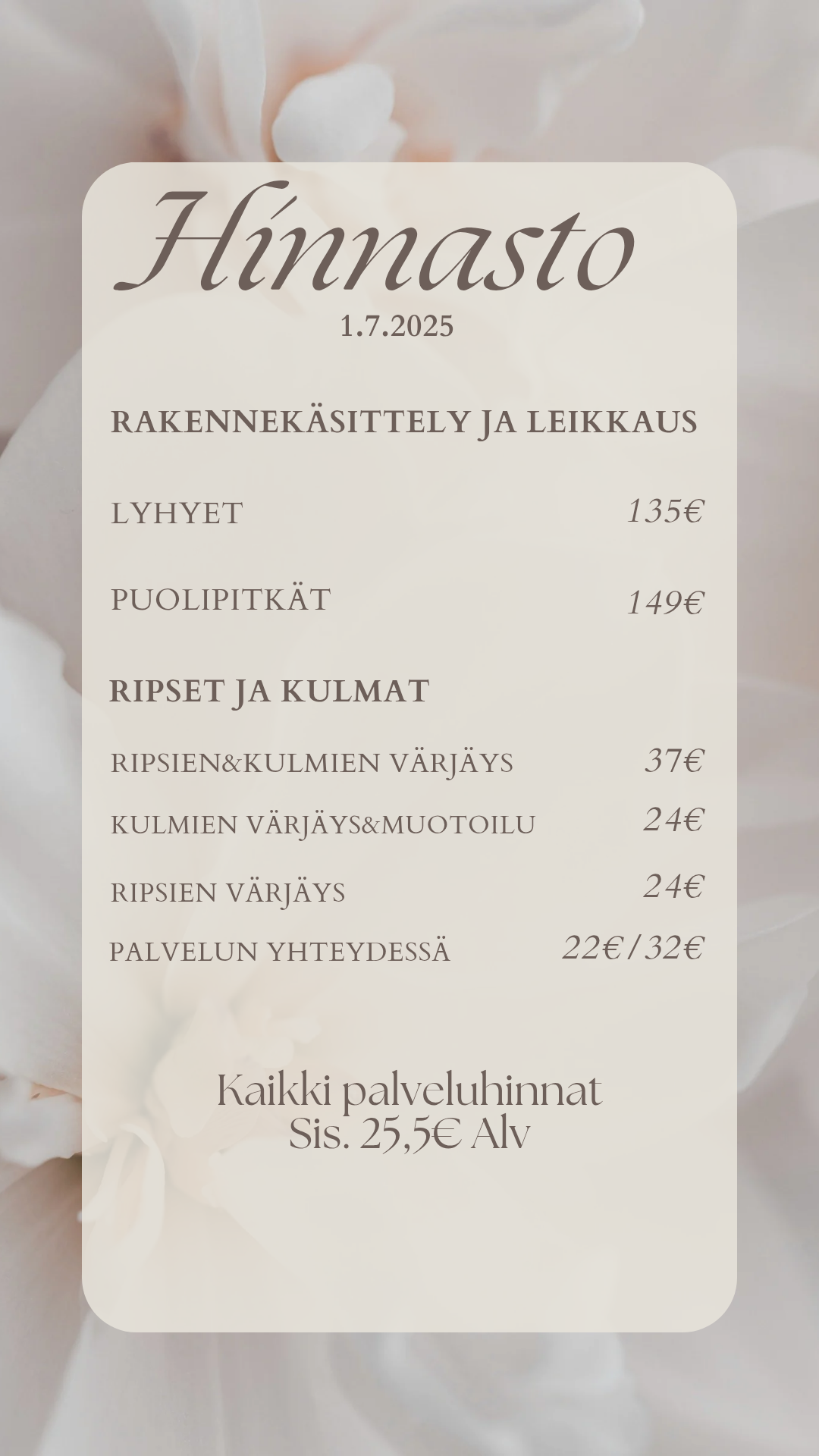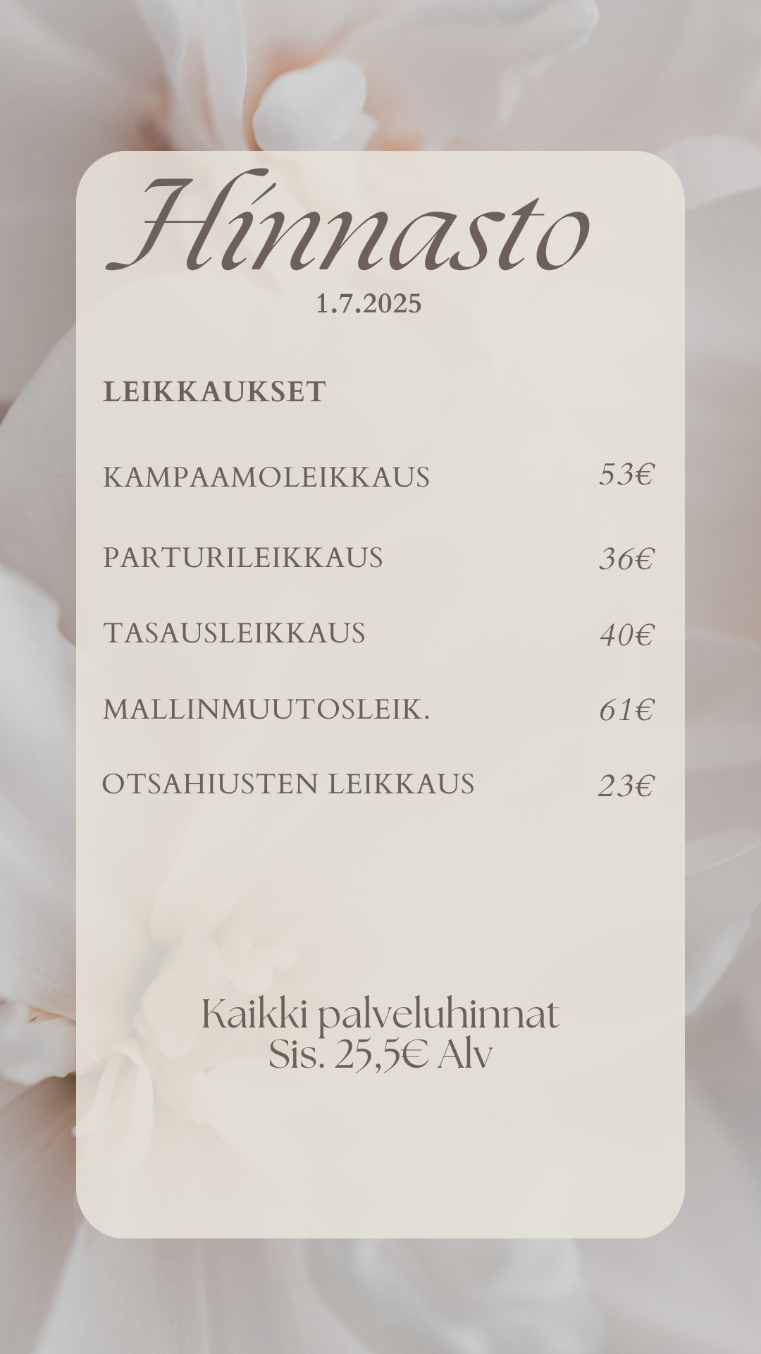 1.7.2025 alkaen kaikki palvelut uuden hinnaston mukaan.